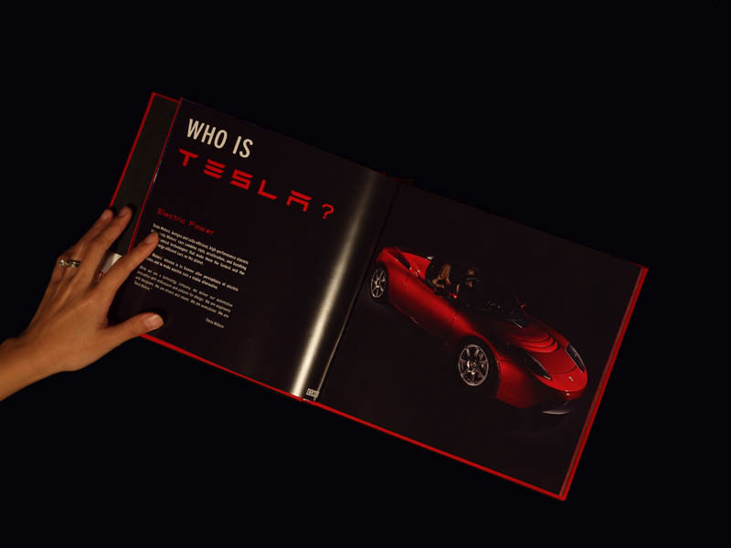 The slip case was 3D modeled and shaped to evoke automotive geometries. After it was 3D-printed, the 2-piece case was sent to an automotive body shop to receive a professional, high-gloss paint finish. The book was hand-wrapped in red fabric with custom embossing of "plus" and "minus" signs to symbolize the electric nature of the automobiles produced by the recipient.