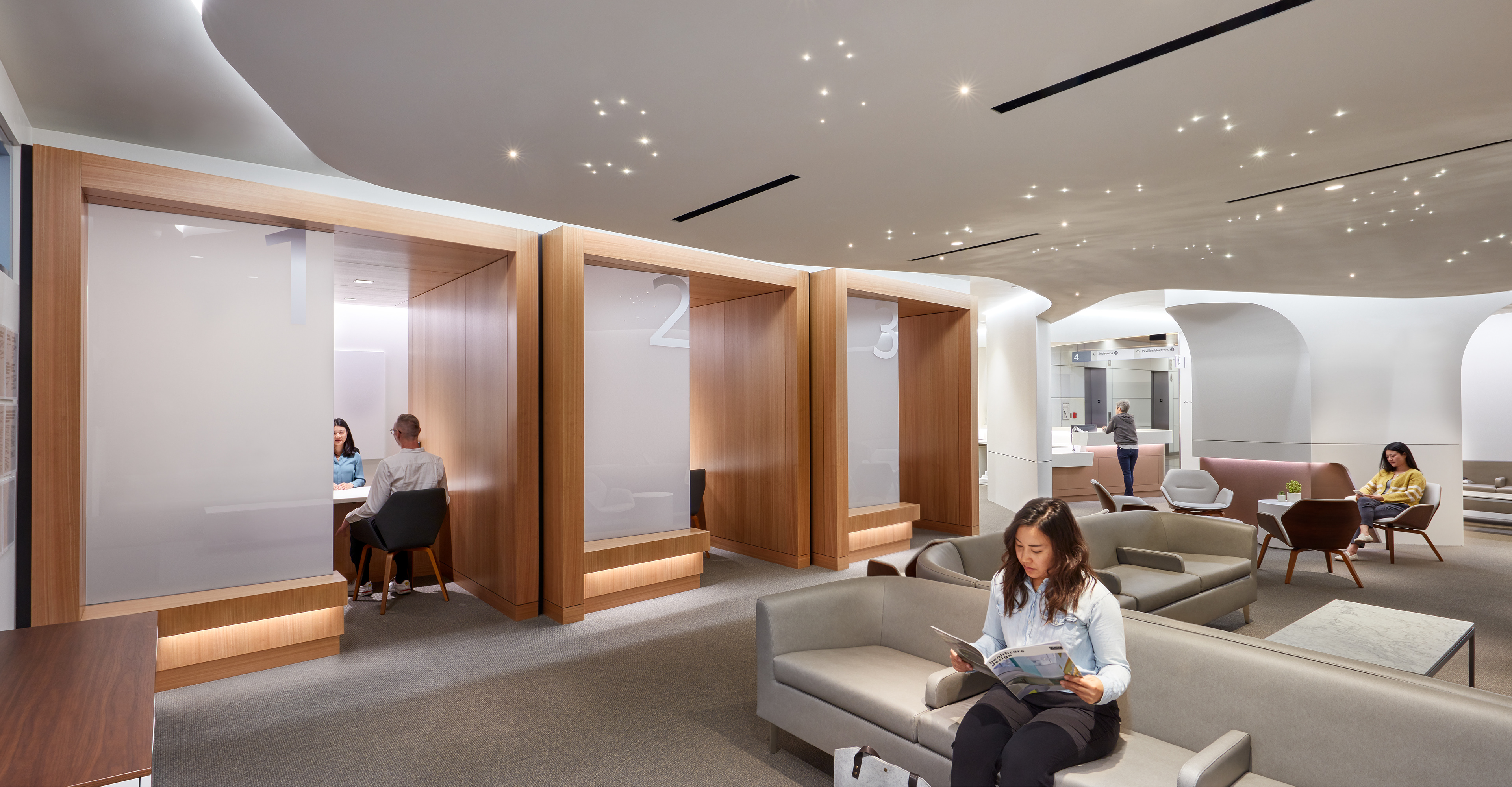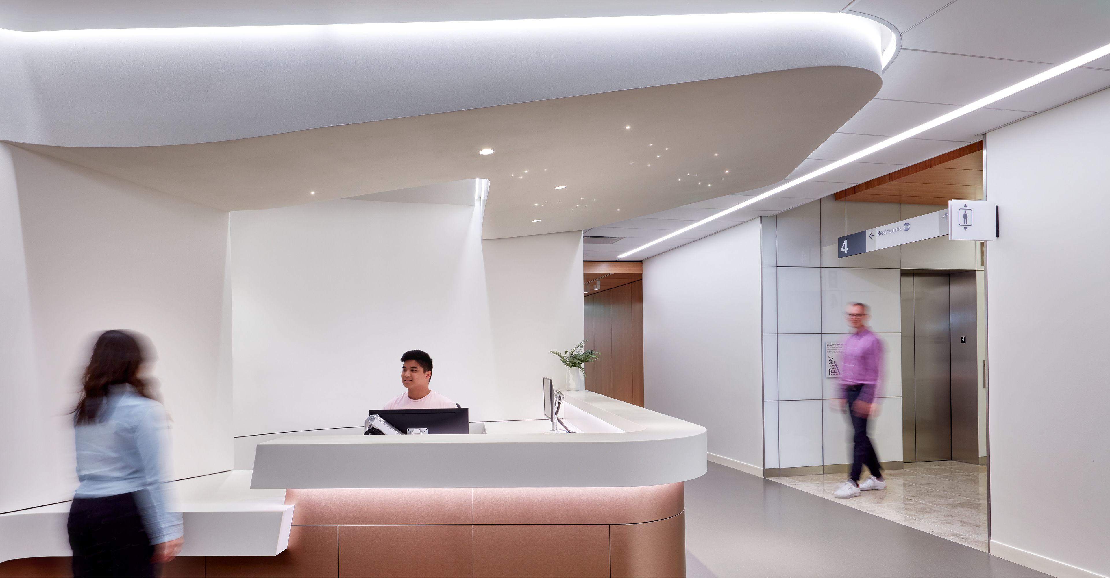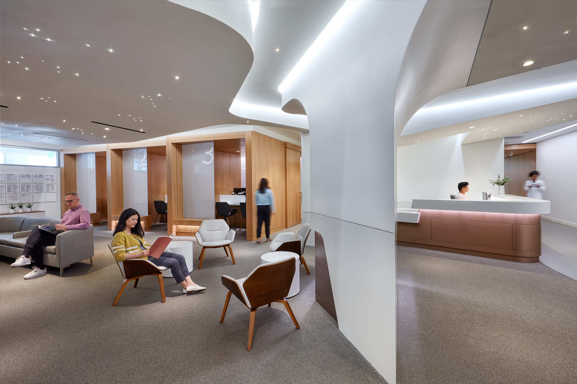 The Advanced Sciences Pavilion, executed by another architect adopted an interior design concept of ‘earth to sky’. At the client’s request we interpreted the manner in which that concept would manifest itself within this project. We approached the design with the notion that this level occupies the tree canopy, a green zone between the earth and sky where dappled light gently filters through. Throughout the floor, this concept is represented through various representative materials and fluid geometry.