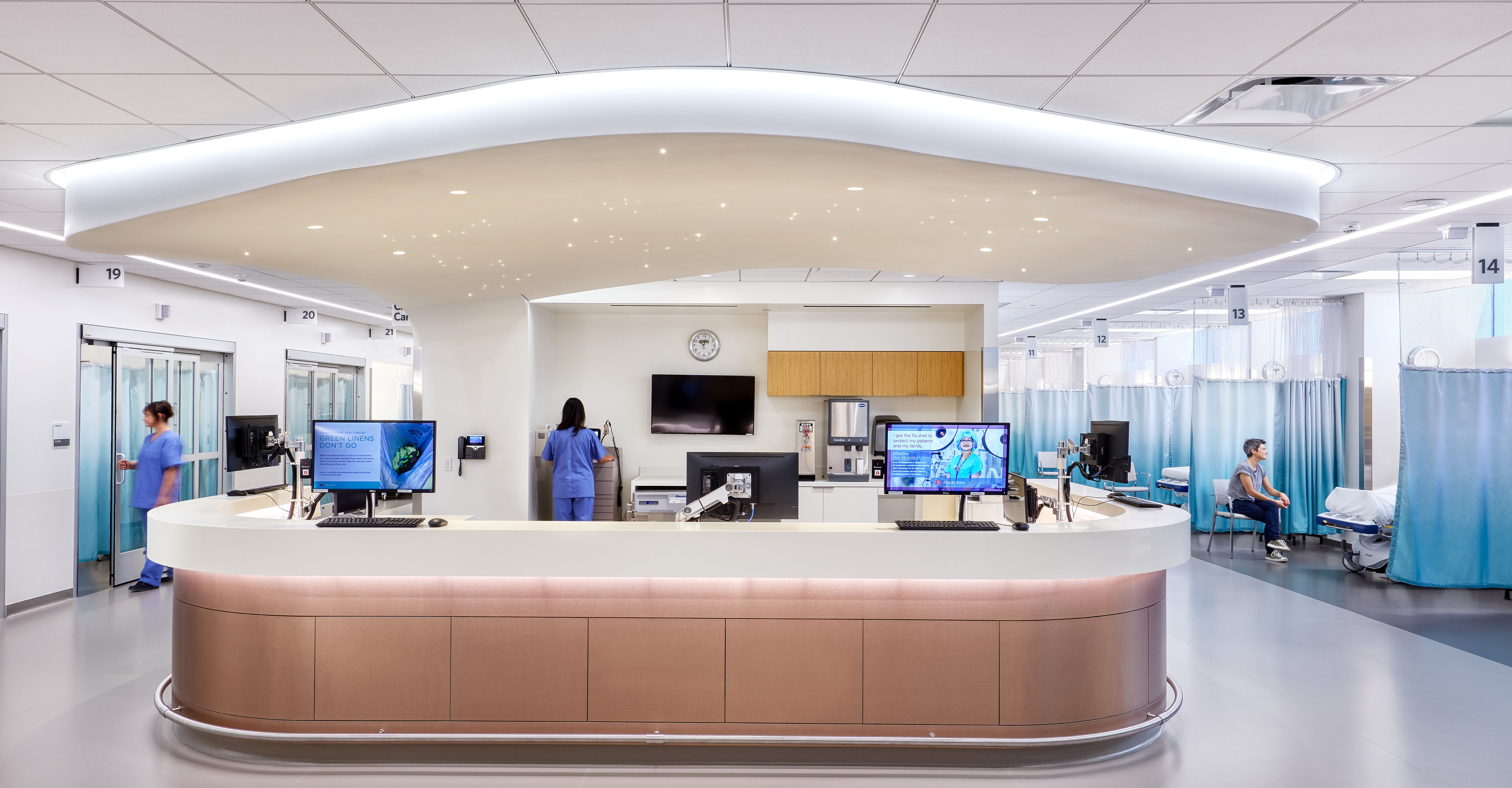 This surgery suite occupies 45,000 sq.ft. on the fourth floor of the Advanced Health Sciences Pavilion at Cedars-Sinai in Los Angeles. The facility provides 13 operating rooms, 16 pre-op stations and 17 post-acute care unit stations. An on-stage / off-stage surgical corridor configuration separates the pre/post surgical circulation from the general services circulation. The services rendered here include ENT / Dentistry, OB/GYN, plastic surgery, opthamology, OP general surgery, urology, breast OP, hand and foot and sports medicine.