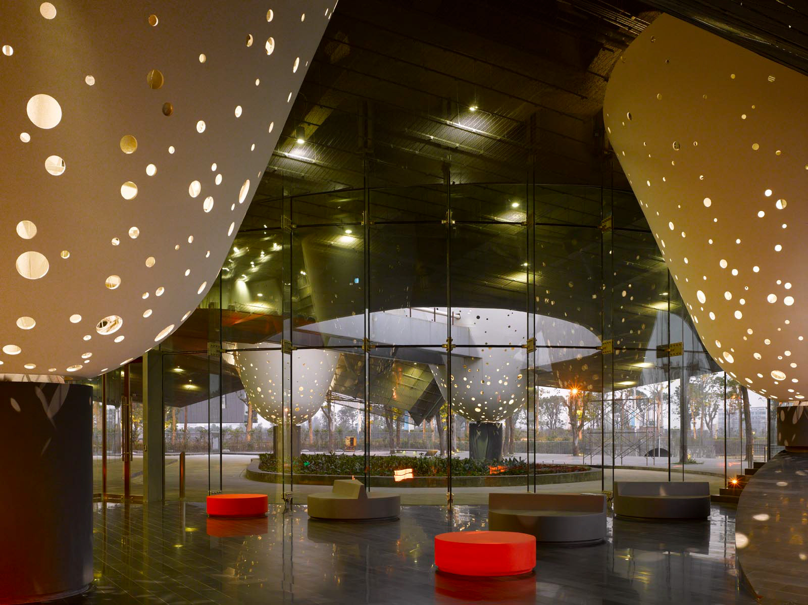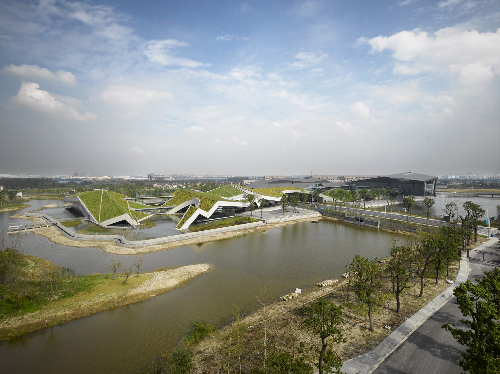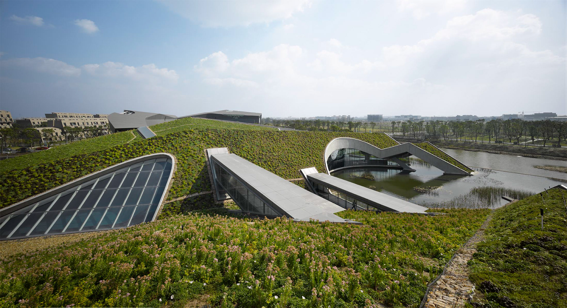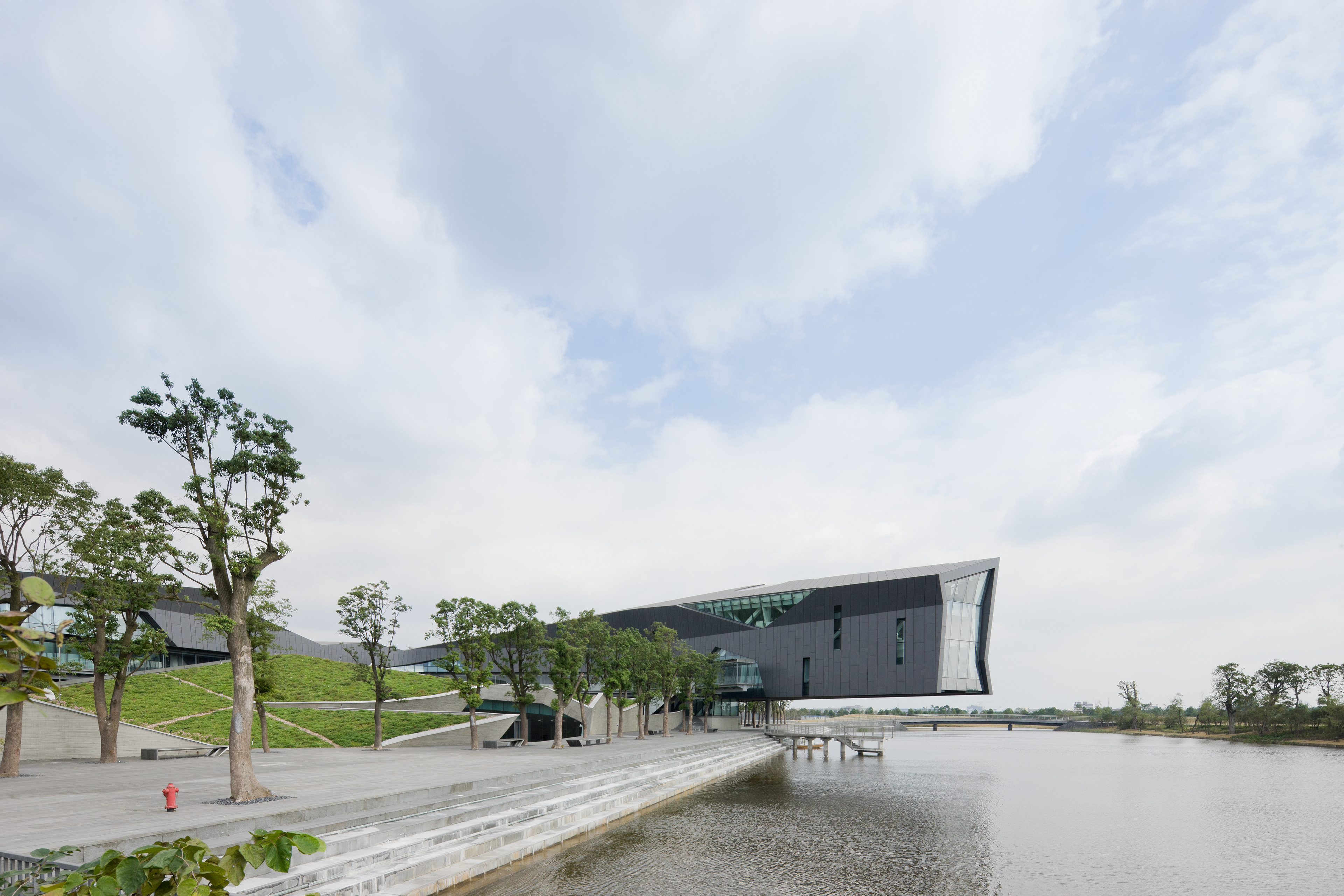 The Giant Group project is a compact village situated amid existing canals and a new man made lake that accommodates diverse functions in a flexible framework of forms that move in and out of a folded landscape plane. The East Campus office building contains three zones: open, non-hierarchical office space; private offices, and executive suites, which cantilever dramatically over the lake. Additional program is integrated into the lifted landscape, including a library, an auditorium, an exhibition space, and a café on the east campus. On the West Campus, additional program space is submerged below an expansive, undulating green roof which includes a pool, a multi-purpose sports court, and additional relaxation and fitness spaces for employees. The landform culminates to the west at a company guest hotel where glass-floored private bedroom suites project over a wildlife pond.