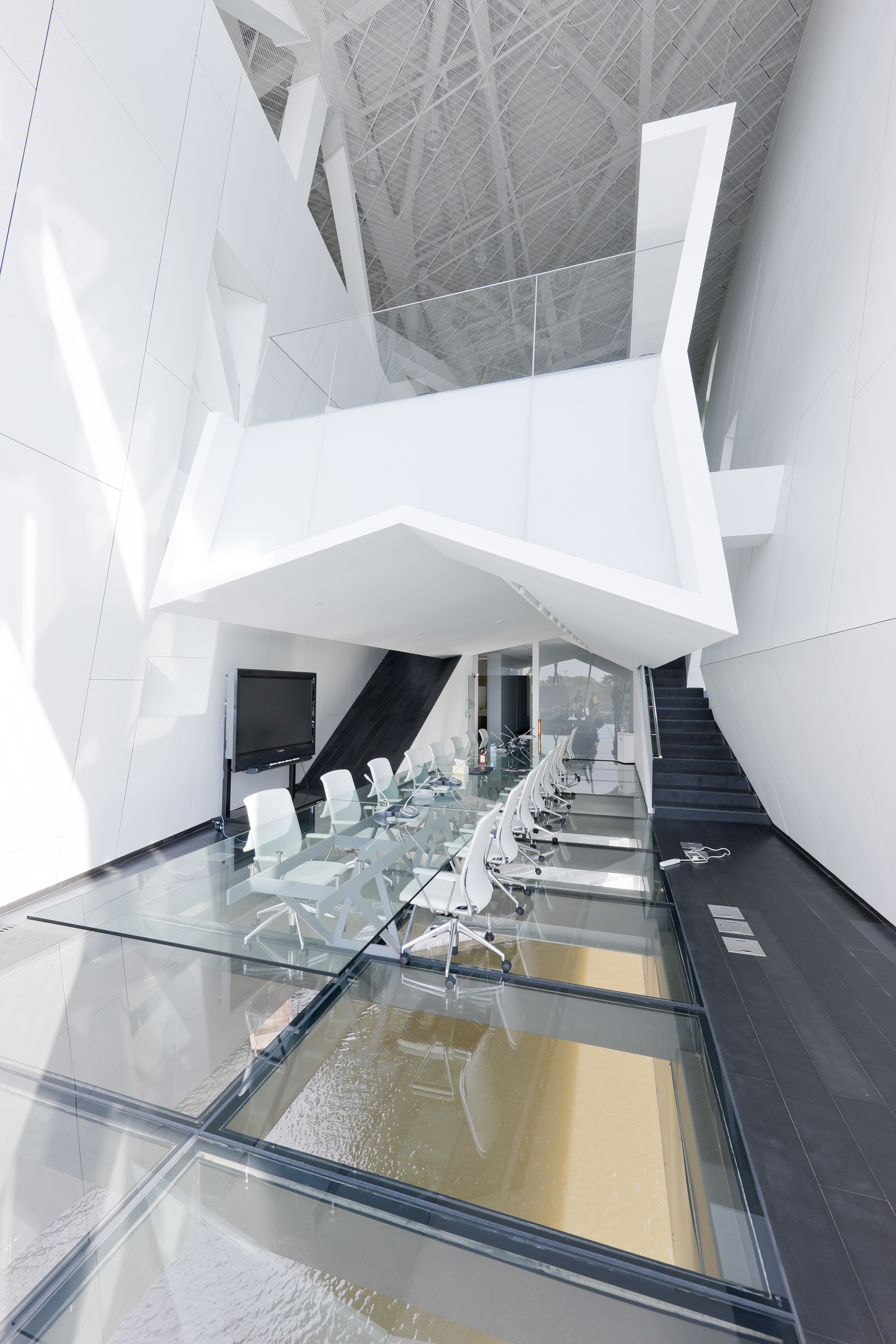 A range of features on the project maximize both energy efficiency and occupant comfort. The West Campus’s landscaped green roof provides thermal mass that limits the heat gain and reduces cooling expenditures. The façade’s double skin and insulated glass curtain wall minimize solar heat gain and improve overall efficiency. The central circulation spine, along with the recreational amenities and plazas provide opportunities for chance encounters and places for employees to gather without the confines of cubicles or unnecessary divisions. The narrow profile of the office building combined with a system of skylights ensure that employees have continuous access to natural daylight.