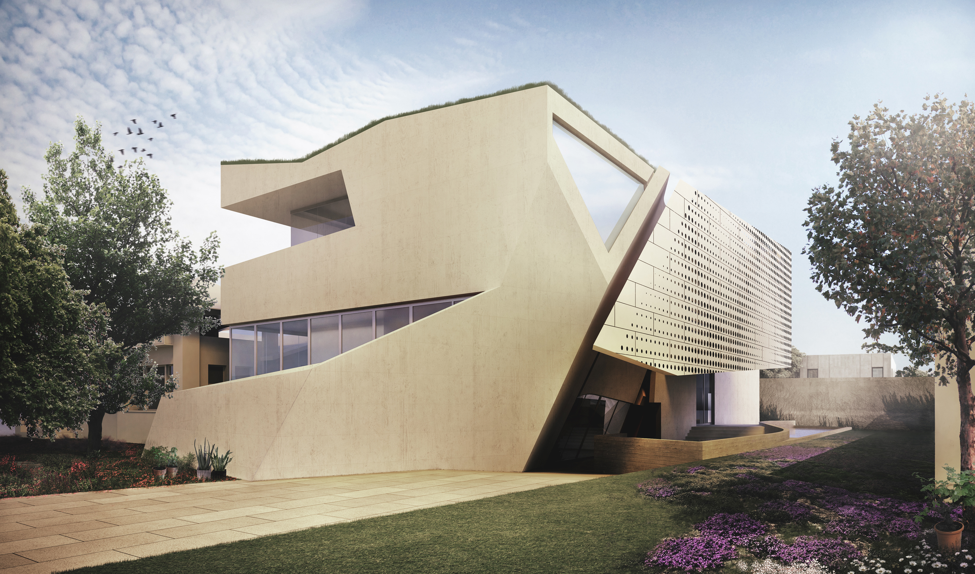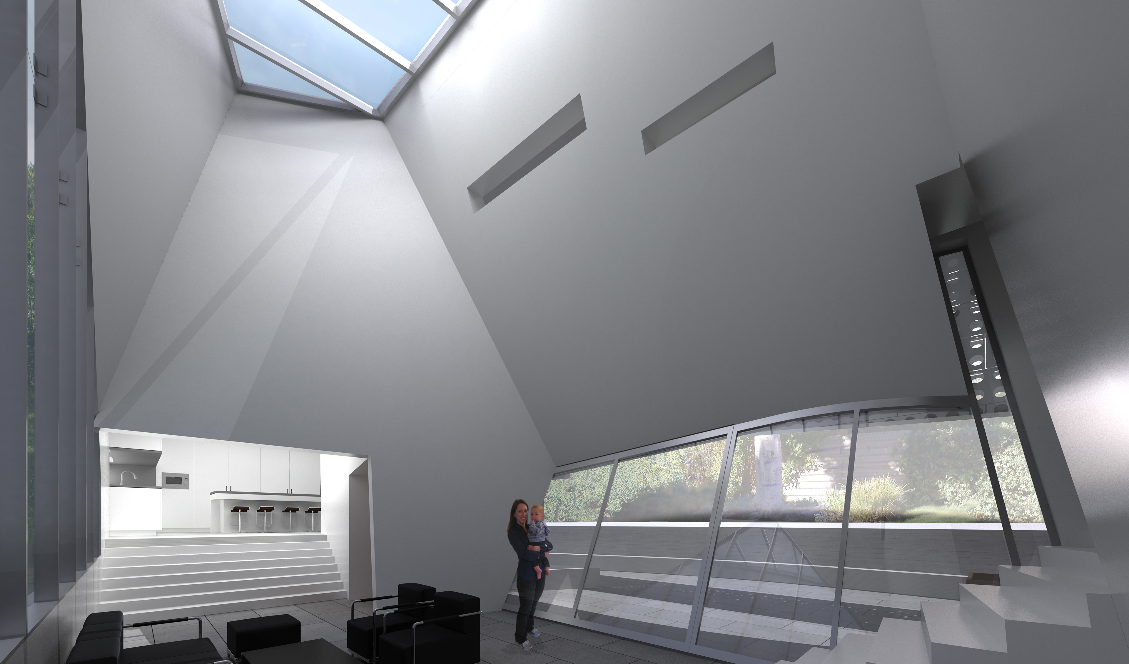 A landscaped roof provides additional insulation and heat gain reduction while the central skylight and plentiful north facing glazing maximize natural daylighting.