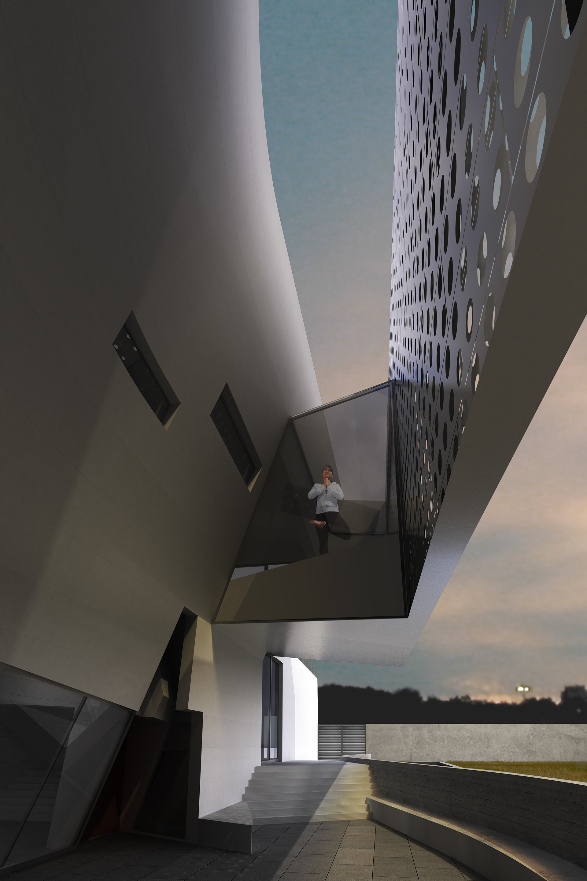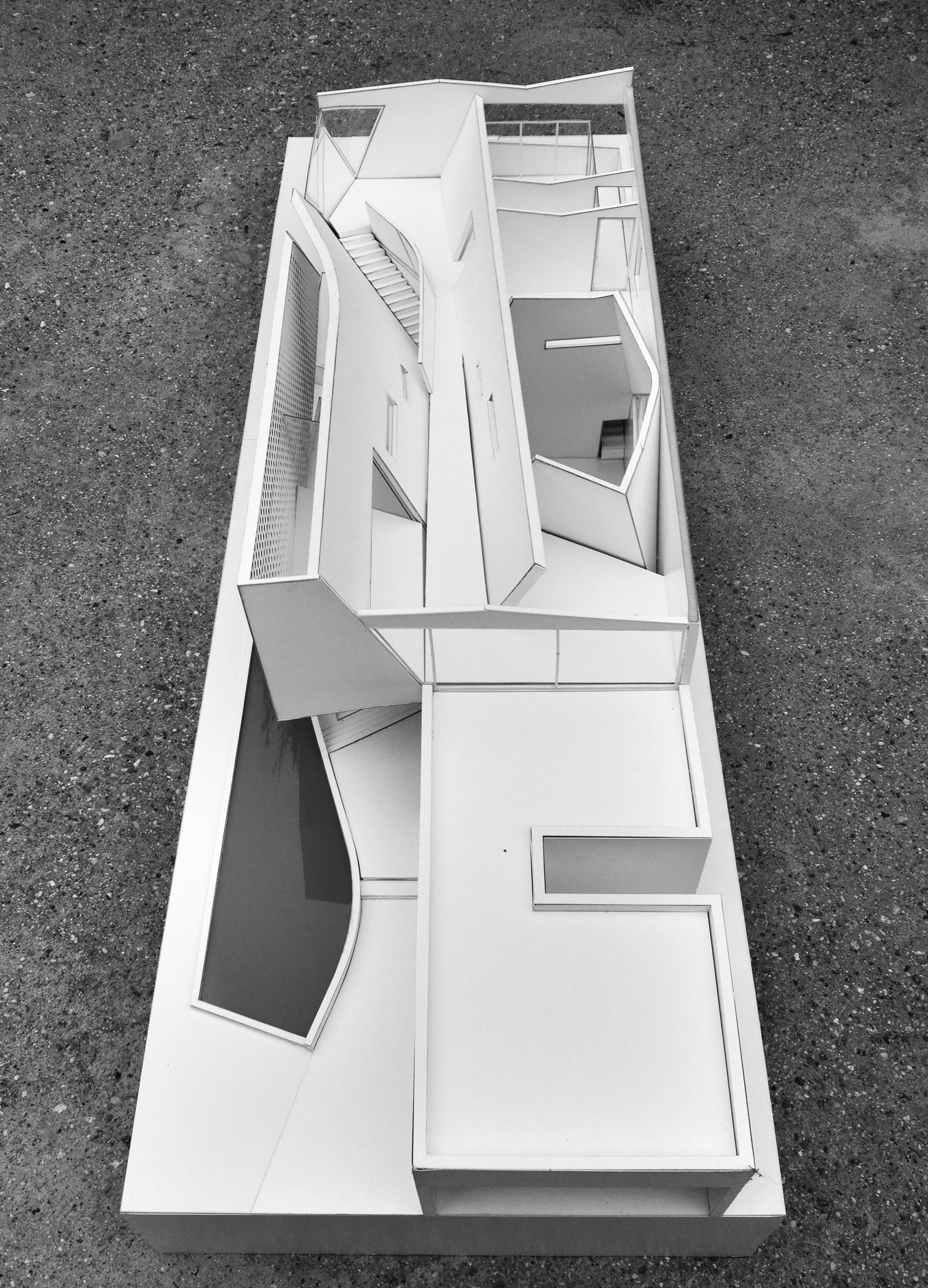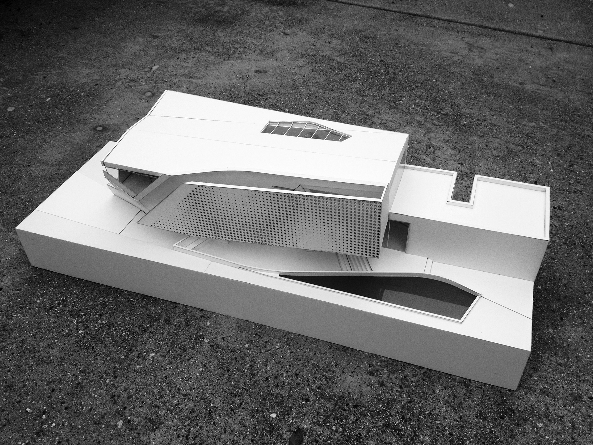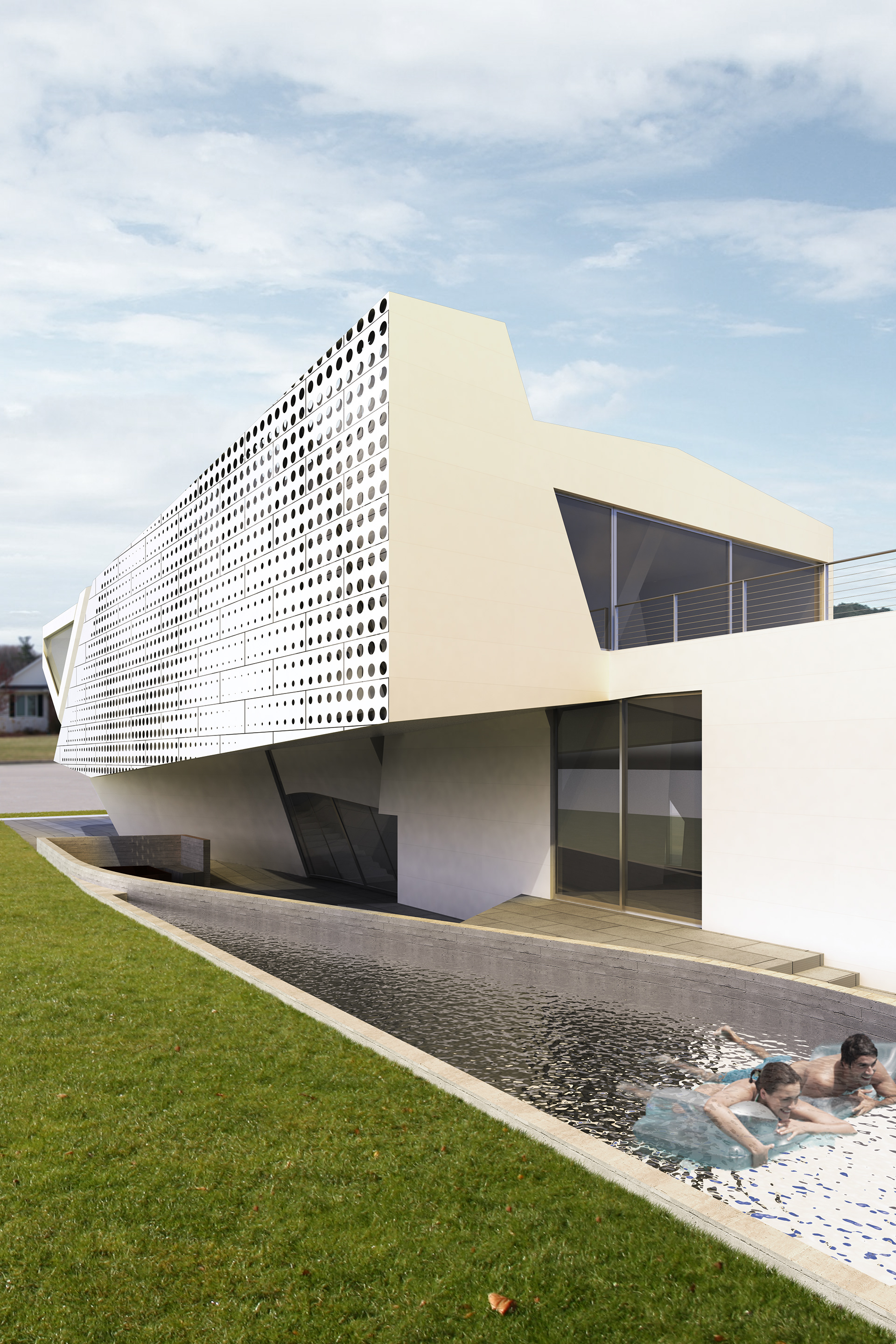 The entry to the home occurs alongside a large curving, sloping feature wall that leads visitors to the sunken outdoor living space where a partial enclosure above filters the direct sunlight by means of a perforated panel system. Separating the indoor and outdoor living spaces is a large, sliding glass panel that when raised joins the two rooms. The lowering of the living spaces creates dramatic double-height volumes with focused views of the sky above. A private guest suite is located street-side with a tall enclosure surrounding an outdoor garden while the remaining bedrooms and master suite are located on the second level. Overlooking the outdoor living space, the master bedroom is further extended by an exterior deck.